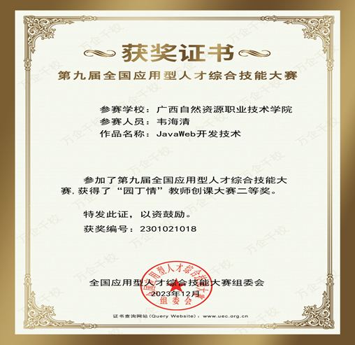 我系韦海清老师参加了第九届全国应用型人才综合技能大赛,获得了“园丁情”教师创课大赛二等奖。