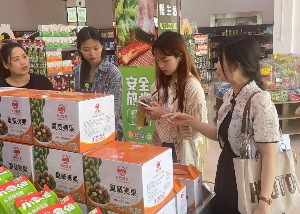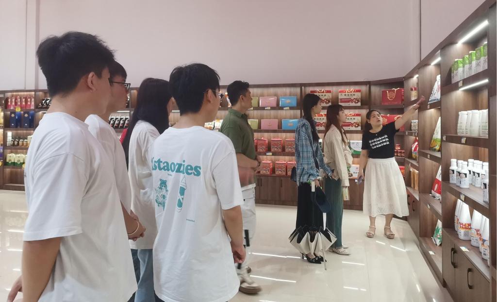 师生一行首先来到广西上龙福绥有礼商贸有限责任公司的健康生活体验馆,店长向同学们介绍了扶绥本土的特色产品姑辽茶、甘蔗汁、夏威夷果、金钱龟酒等。在参观过程中,同学们根据校企合作的网店运营实训项目需要,端起相机,认真拍摄商品图片,为网店装修收集素材。