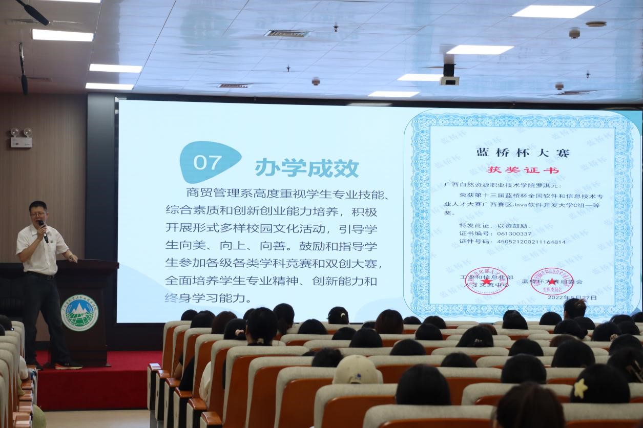 财税金融融创团队召集人冯萃萃老师向新生们详细介绍了专业情况。学校拥有雄厚的师资力量,教师们教学经验丰富、专业素养高;历届优秀毕业生各有风采,在各自岗位上继续发光发热。在实习与就业方面,学校与众多企业合作,为学生提供广阔平台;大数据与会计专业毕业生的就业率节节攀升,2024年大数据与会计专业学生就业率达到88%。在技能竞赛方面,大数据与会计专业的学生在2022—2024年期间取得了14项广西教育厅颁发的区级竞赛奖励和多项行业赛奖励,硕果累累。最后,冯萃萃老师展望未来,激励新生努力学习,开启精彩人生篇章。