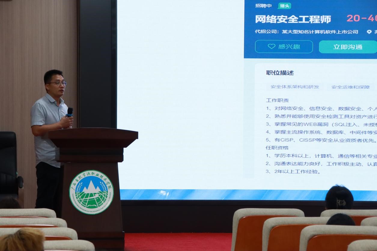 在信息安全技术应用专业的入学教育中,信息技术融创团队召集人李永滔联合广西塔易信息技术有限公司的资深工程师杨子河,共同对信息安全技术应用专业进行了专业发展前景的深入剖析、学习方法的精准指导以及企业岗位实践经验的宝贵分享。企业工程师以其丰富的实战经验和独特的视角,向同学们展示了信息安全领域的无限可能与广阔天地,激发了大家对该专业的浓厚兴趣与探索欲望。
