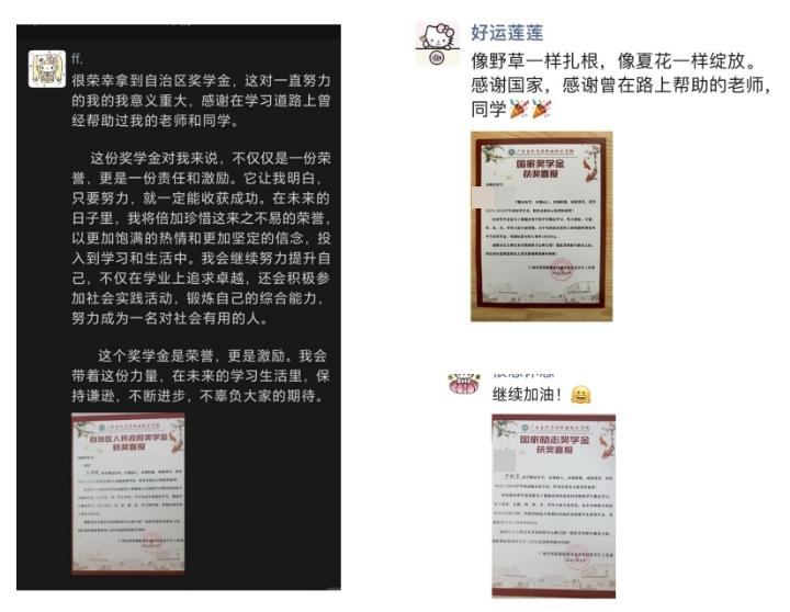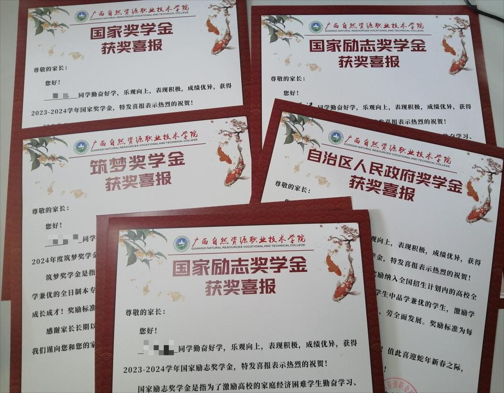 优秀的学子们在勤耕不辍的路上一路前行,昼夜更迭,取得了优异成绩,成为了同龄人中学习的榜样。学生及家长接到喜报后,激动、自豪的心情溢于言表。学生们纷纷在朋友圈分享照片,感谢学校对自己的精心培养,并表示将继续奋发前行,以优异的成绩回报母校。家长们更加坚定了当初送孩子到广西自然资源职业技术学院就读的那份选择。这是一份特别的惊喜,铭刻了学生的奋斗和成长,承载了系部的人文关怀和育人温度,寄托着系部加强家校联系的美好愿望,传递着分享喜悦的快乐和幸福。