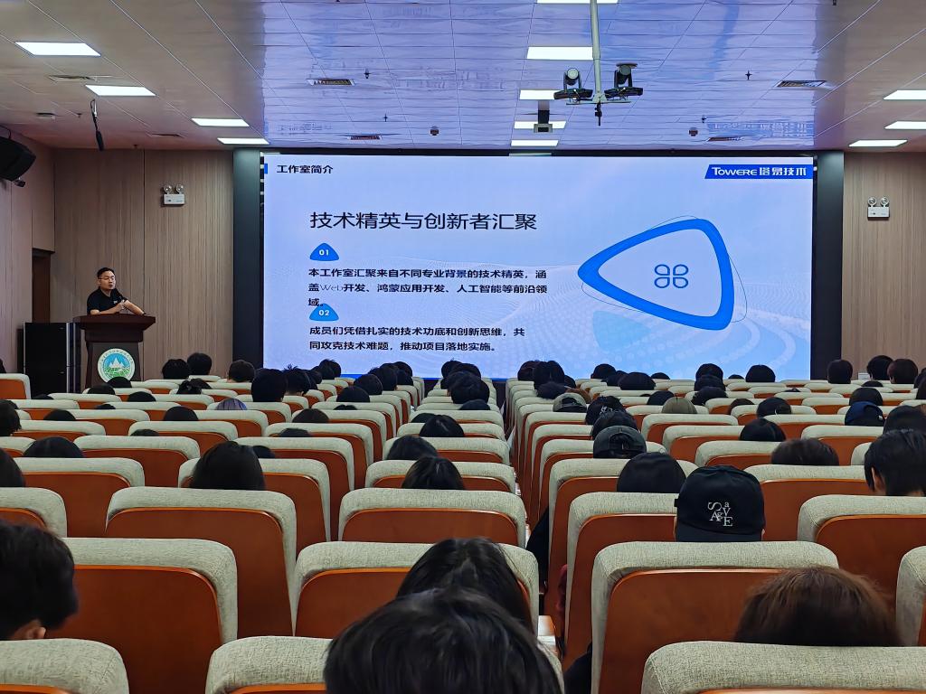 “工作室采用企业真实项目驱动模式,涵盖Web开发、鸿蒙应用开发、人工智能等前沿技术领域。”李老师详细介绍了工作室的运营模式、团队构成以及学生参与方式。他表示,工作室将为入选学生提供专业技术指导、项目实践机会以及相应的福利待遇。