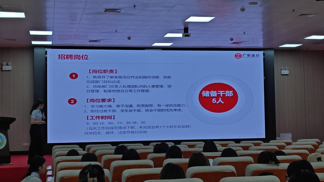 近日,东莞市莞誉财税咨询有限公司(以下简称莞誉财税)与广东金众科技有限公司(以下简称金众科技)携手进入校园,面向商贸管理系大数据与会计专业2023级学生举办宣讲会,旨在为学子们提供更多就业机会。