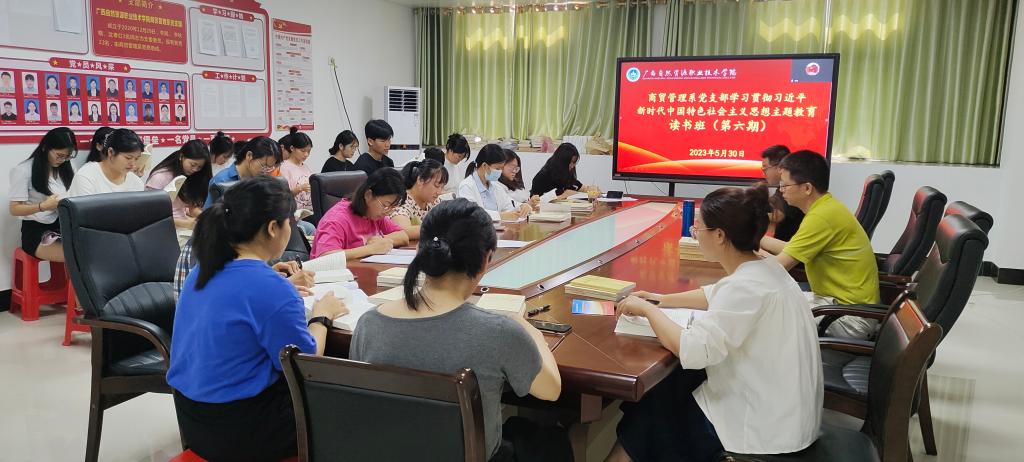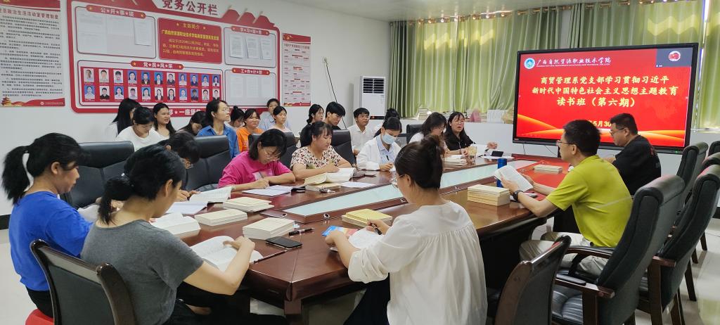5月30日上午,商贸管理系党支部于行政楼403党员活动室举办学习贯彻习近平新时代中国特色社会主义思想主题教育读书班(第六期),全体党员、积极分子参加此次活动。