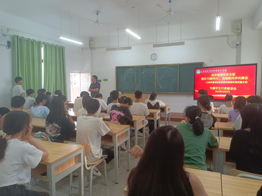 为扎实开展学习贯彻习近平新时代中国特色社会主义思想主题教育,了解当前学生的诉求,以调查研究找准系部落实立德树人根本任务的着力点,6月6日下午,商贸管理系在1号教学楼301教室组织学生代表召开强化“问题导向”,加强教风学风建设-以高质量调研推动商贸管理系高质量发展专题学生代表调研座谈会。系党支部委员、教学秘书、全体专职辅导员及40余名学生代表参加,系党支部书记、系主任李斌出席并主持调研座谈会。