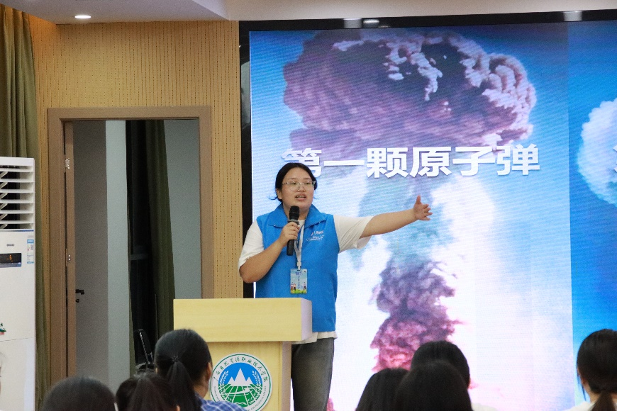 商贸管理系“两弹一星”志愿者宣讲团志愿者轮流上台,结合精心准备的PPT、视频资料以及实物模型,为同学们讲述了中国核工业的3个30年,分享中国第一颗原子弹和氢弹的成功爆炸、人造卫星发射等重要历史事件背后的故事;了解那些为国家科技事业默默奉献的老一辈科学家和技术人员的先进事迹,邓稼先、钱学森、郭永怀等“两弹一星”元勋的光辉形象深深打动了在场的每一位听众。