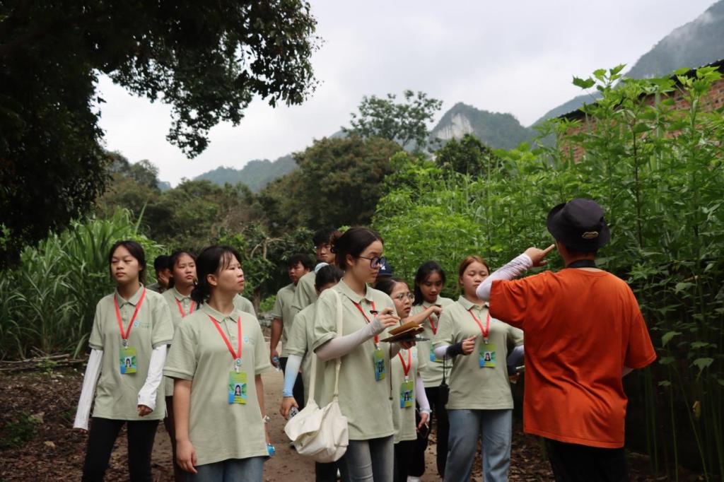 驮押屯位于广西崇左市大新县榄圩乡正隆村,处于喀斯特地貌区域,是生态旅游示范村屯。实践团深入村屯探寻丰富生态资源,观察石山苏铁、同色兜兰等珍稀植物,了解乡土植物的实用价值。实践团成员还目睹了冠斑犀鸟归巢,感受其为生态旅游带来的活力。此外,实践团成员还与广西民族师范学院师生一同参与保护区组织的自然研学活动,了解生态研学魅力的同时,也进一步深化两校沟通交流,共助乡村生态发展。