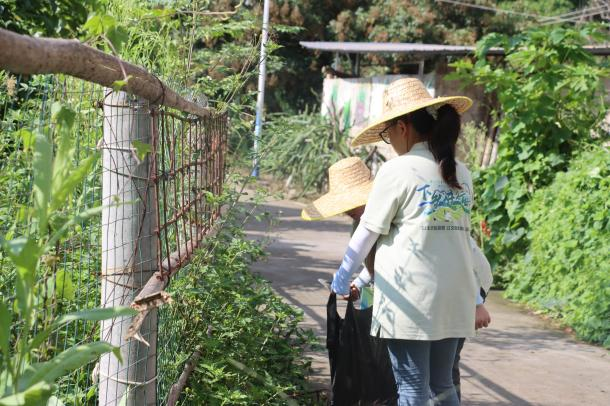 实践团以“洁净赋能乡村振兴,行动始于足下”为行动宗旨,化身村容“美容师”为驮押屯添彩。成员们手持工具钻进鸟咔咔自然学校,蹲身拔除疯长的杂草,连砖缝里的嫩芽都细心清理;又沿着村屯巷道一路前行,弯腰捡拾散落的垃圾,将散布角落的杂物一一收纳。这场行动不仅让村容村貌焕然一新,更以“看得见的改变”为驮押屯的生态旅游擦亮底色。