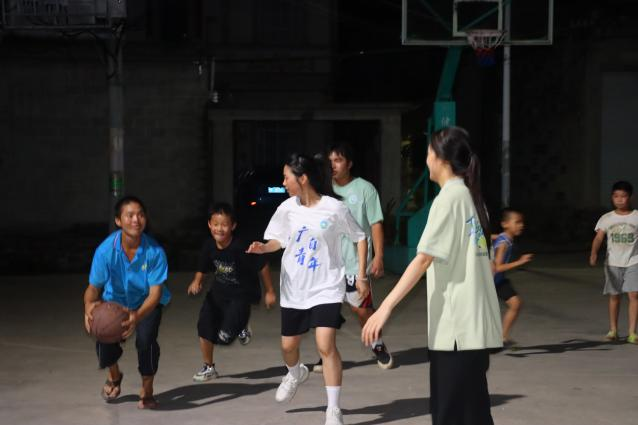 球场上,实践团成员与村民、孩子们混编组队,既有少年们为了进球铆足劲的冲劲,也有村民大叔们带着“老当益壮”的拼劲。实践团不仅当球员,更当“服务员”——有人画场地、做裁判,有人给球员递水、为观众搬板凳,让赛场始终充满欢笑与温暖。“以前娃们放学就玩手机,现在跟着哥哥姐姐们练球,学会了输不气馁、赢一起乐,这就是最好的成长!”村民韦阿姨看着场上奔跑的孩子,眼里满是感激。这场“村BA”,让“三下乡”的服务不止于形式,更在团结协作中教会孩子们责任与担当,为乡村注入了拼搏向上的精神力量。