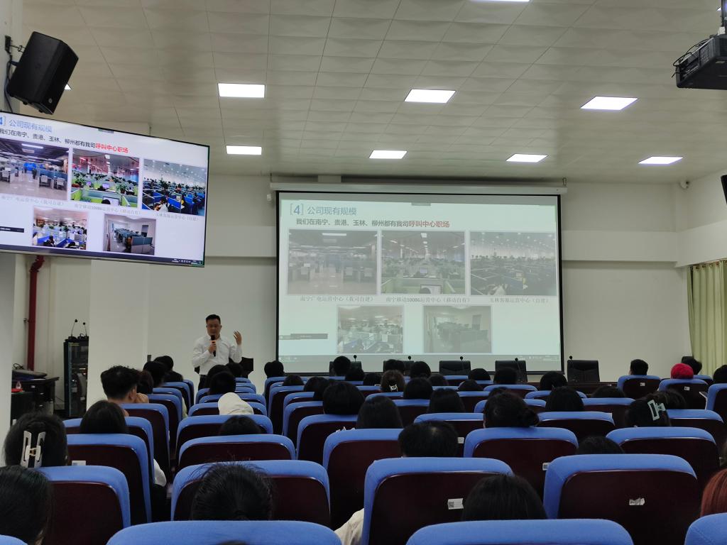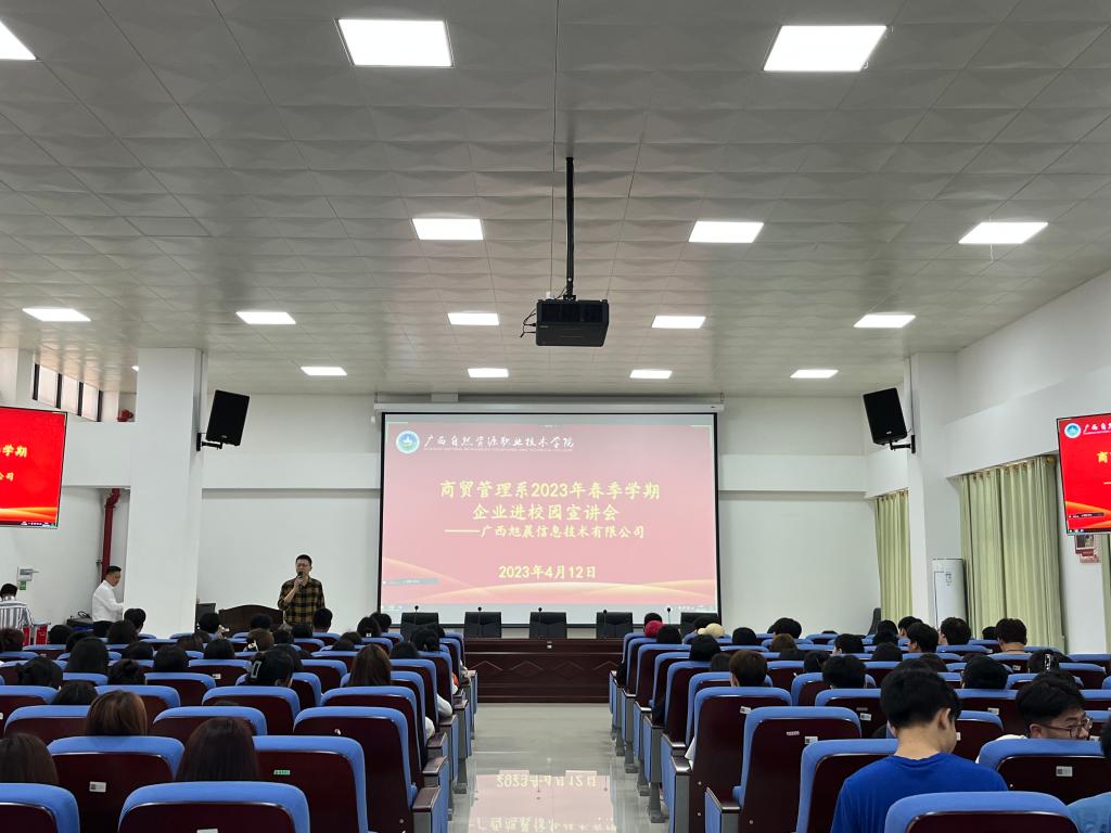 4月12日下午,商贸管理系联合广西旭晨信息技术有限公司在行政楼501会议室举行2023年春季学期第二场“企业进校园”专场实习就业宣讲会,线上线下共300余名学生参加,商贸管理系主任李斌、全体辅导员出席本次宣讲会。