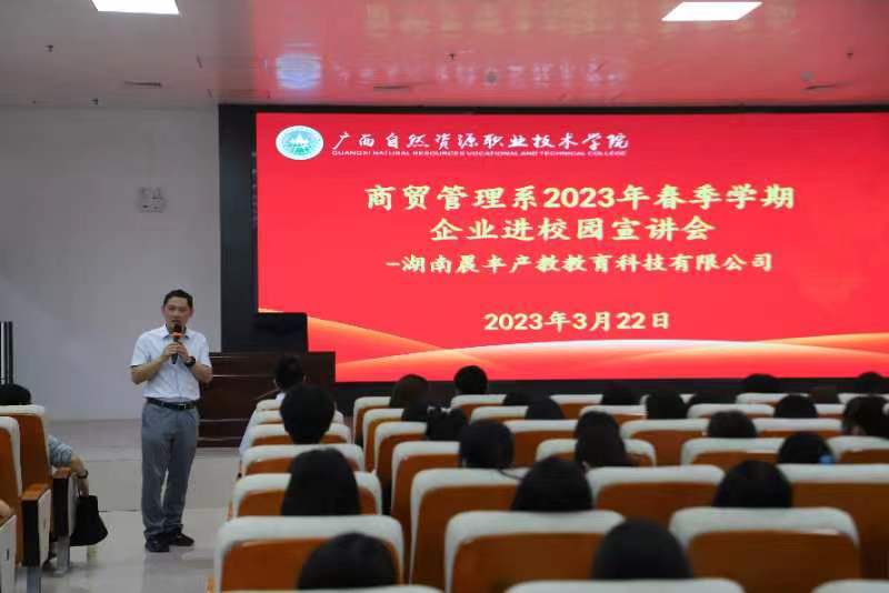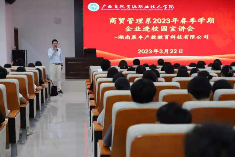 3月22日下午,商贸管理系联合湖南晨丰产教教育科技有限公司在图书馆报告厅举行2023年春季学期首场“企业进校园”专场宣讲会,学院党委副书记兼纪委书记刘勇出席,宣讲会由商贸管理系主任李斌主持。活动伊始,刘勇副书记致辞,他强调岗位实习是人才培养中非常重要的部分,希望同学们都勇敢尝试,把握机遇,抢占先机,提前做好实习就业的准备工作。将自己的发展与国家发展紧密联系在一起,立大志向、上大舞台、入主战场、干大事业,他同时希望学院与湖南晨丰产教教育科技有限公司更深度的开展校企合作,推进产教融合,实现互惠互利的共赢发展。随后,湖南晨丰产教教育科技有限公司孙晨总经理从行业企业文化、发展前景、招聘需求、培训培养、薪酬待遇等方面向同学们进行详细介绍,同学们就自己所关心的薪资待遇、企业需求、公司发展平台与机会等问题与企业领导进行了深入的沟通交流。今后,商贸管理系将继续加强校企联系,定期开展企业进校园系列活动,同时不断调动学生实习就业的积极性,努力实现校企合作共双赢、携手同发展的目标,培养上手快、能吃苦、有后劲的高素质应用技能型人才。